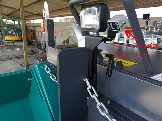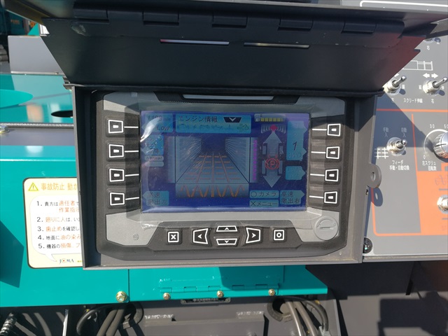 エンジン回転はもちろんアスファルトフィニッシャーのハンドルの切れ角やホッパーの中の様子を確認できるカメラも装備されています。
