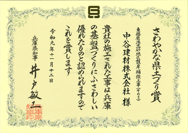 中谷建材株式会社が施工工事を行った「東播磨港高砂地区護岸補強工事(その3)」が兵庫県より令和元年度さわやかな県土づくり賞を受賞しました。