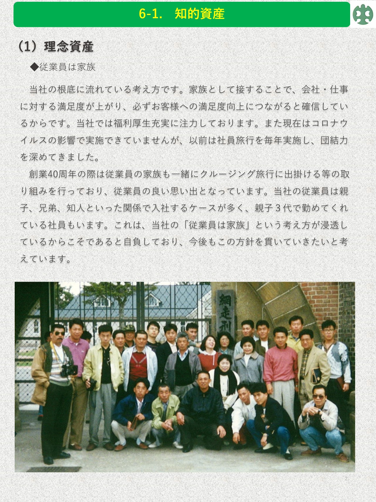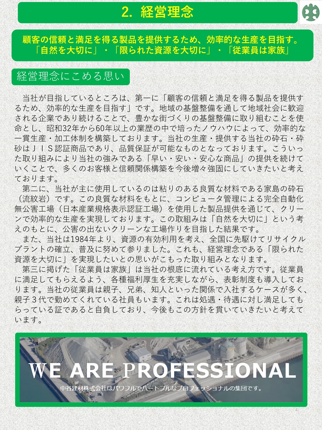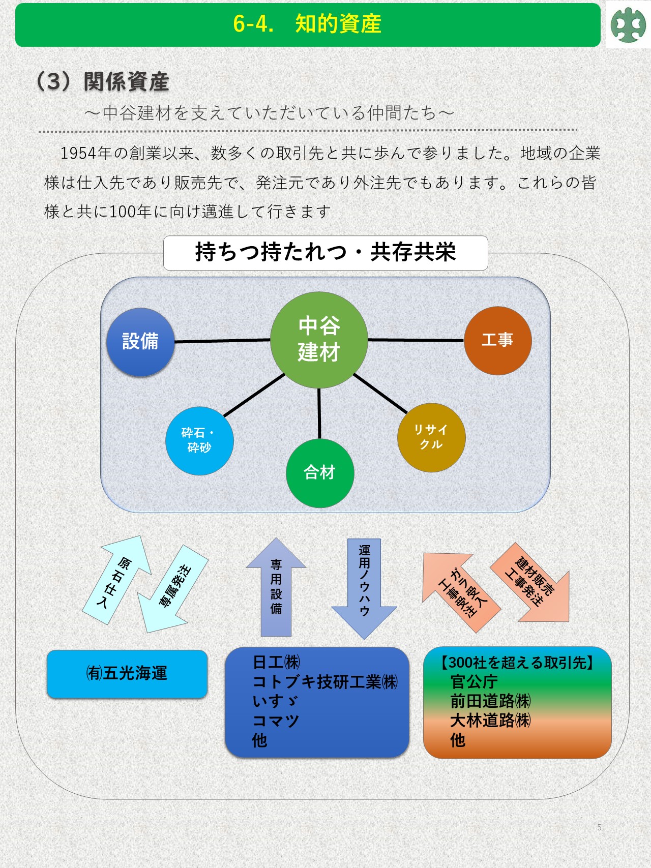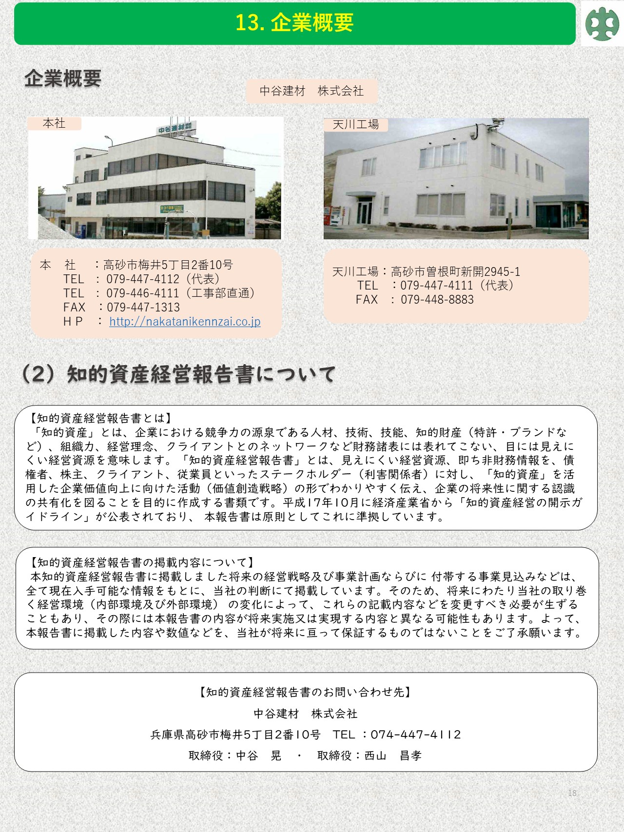 お知らせ 2023.02.25 知的資産経営報告書2022年度版 中谷建材株式会社 知的資産経営報告書 中谷建材株式会社の知的資産経営報告書が完成しました。 創業時から現在に至るまでの遍歴や、弊社の持っている「技術」や「人」を「資産」として考え明文化しています。 これからの将来に向け、弊社の考えるビジョンを表しています。