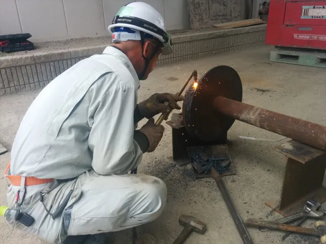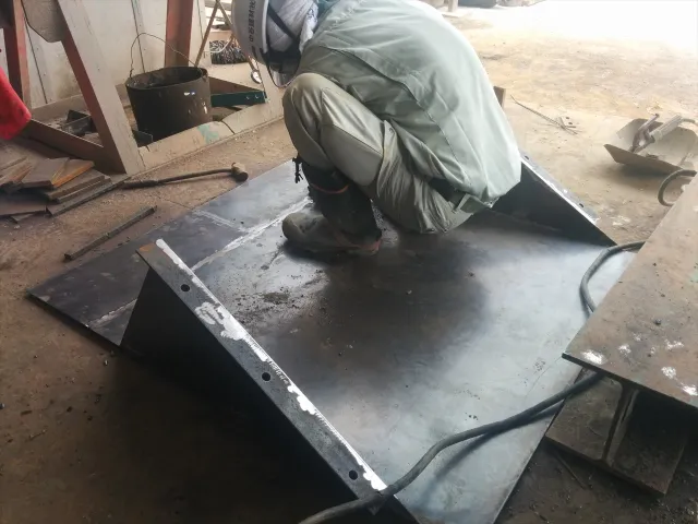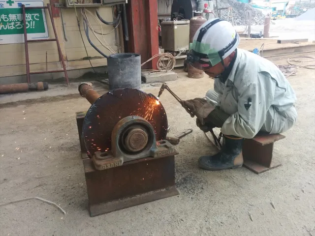 お知らせ 2014.07.07 製造部 作業画像 鉄を切ったり 溶接したり 製造プラントを運営、メンテナンスしていくためにはガス溶断や溶接は必要不可欠です。 鉄板を切ったり、鉄板どうしを溶接したりします。 今日の作業は、ベルトコンベアのプーリを製作する前作業とシュート部を製作しています。