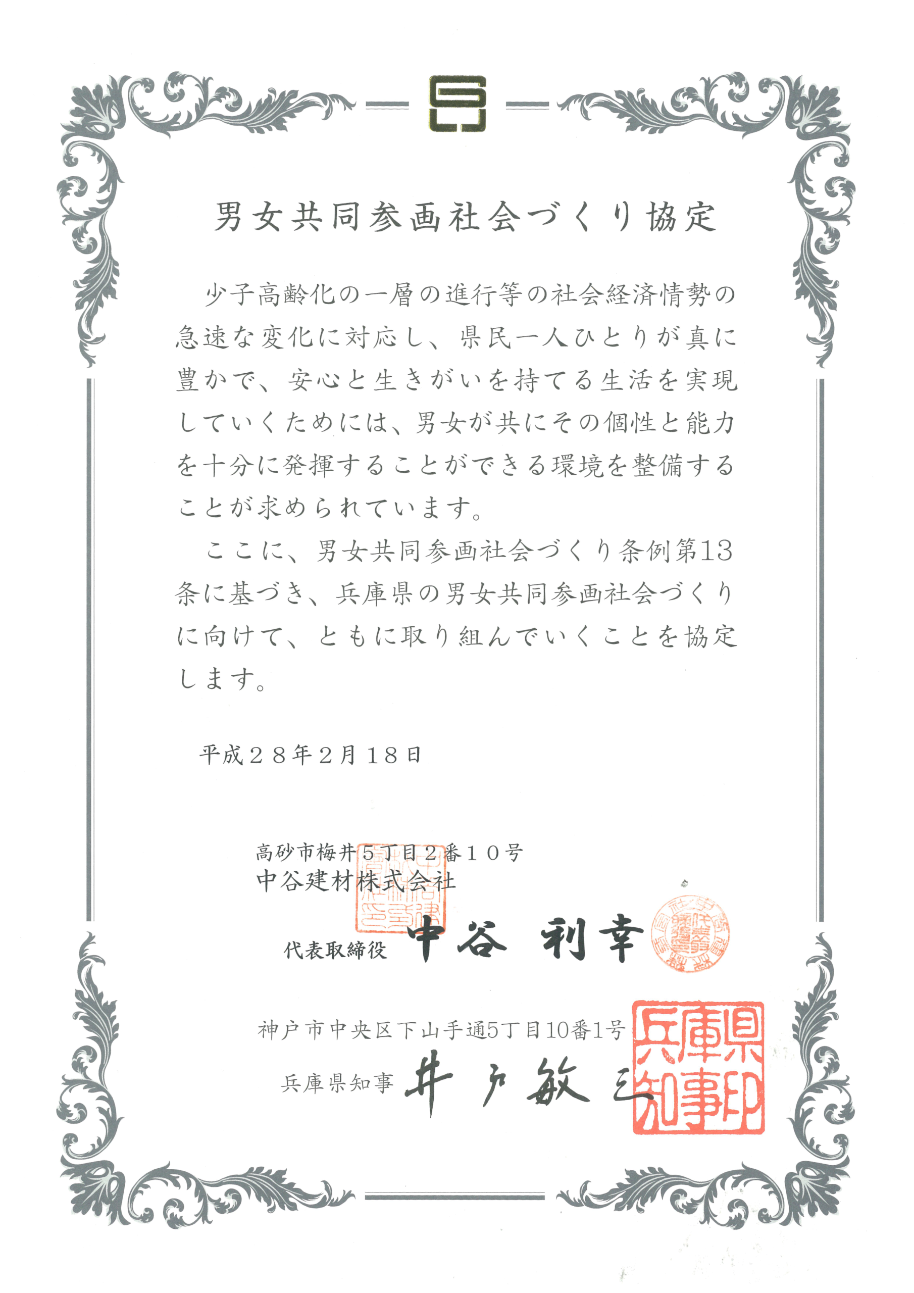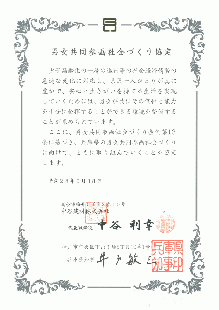 男女共同参画社会づくり協定 兵庫県締結企業はこちら(PDF)弊社 平成28年2月18日 締結 ページ176