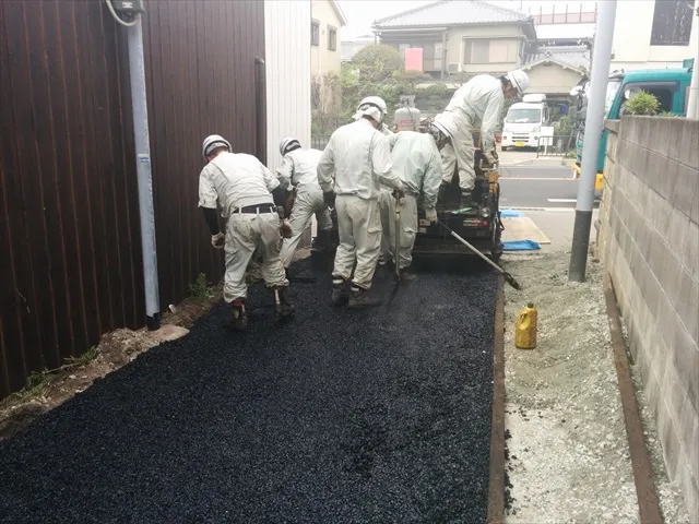 舗装工事 明石市大蔵中町歩道 アスファルト施工 人が歩く歩道を施工 アスファルト舗装を大きく分けると、車が通行する「車道」と人が通行する「歩道」があります。 この現場は、「歩道」です。 透水性アスファルトを使用 雨が降った後に水たまりができないように「透水性」のアスファルトを使用しました。 子どもたちが水たまりで遊んで、靴を汚すこともなくなると思います。 道幅の狭いところも施工 施工現場は軽四の車がやっと通行できるような大変道幅の狭いところですが、施工可能です。 更新日:2026.01.22
