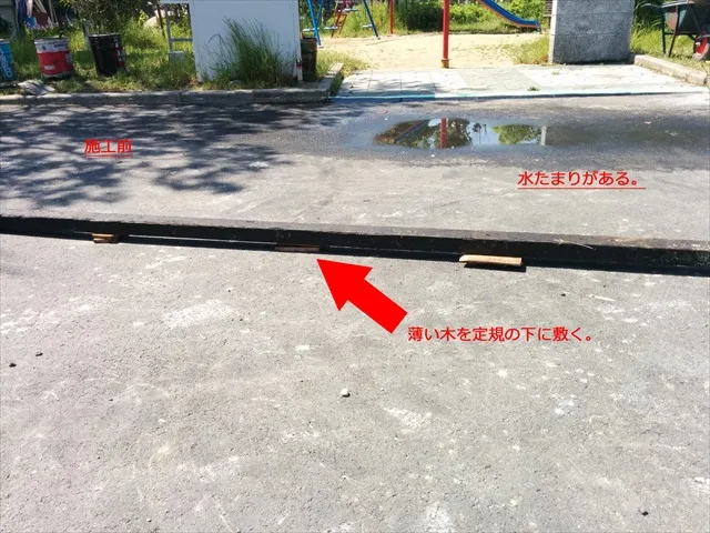 今回の施工場所は「水たまり」ができていたので勾配をつけて水が流れるように施工します。