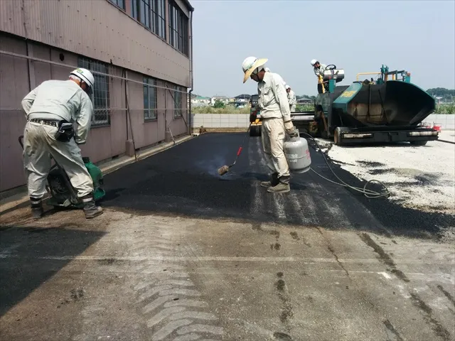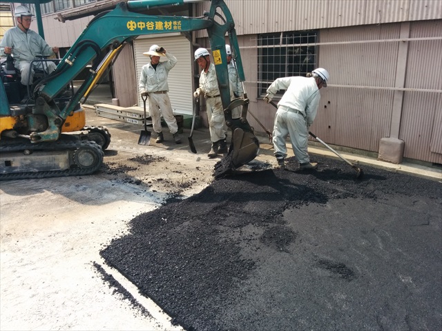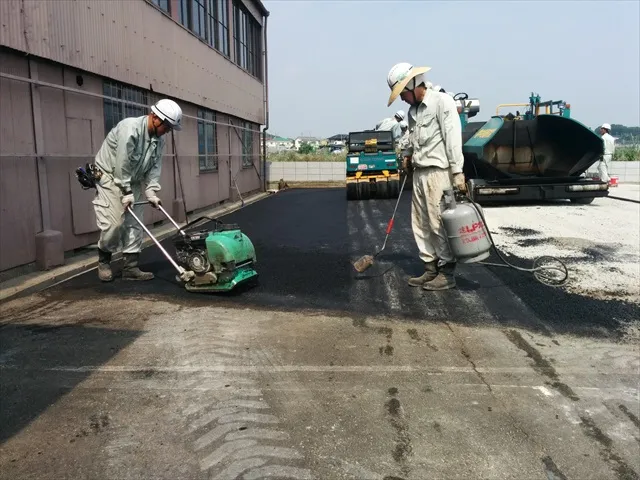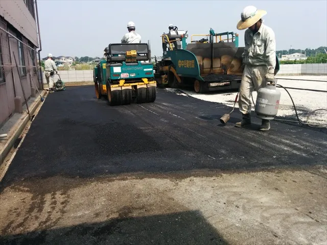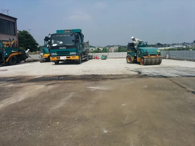 現場は、雑草が生えていましたが一度草刈りをし路盤を施工後にアスファルト舗装の施工を行いました。