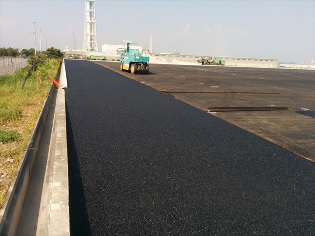 姫路市中島埠頭舗装工事 表層を施工しています。 広い現場です。順序良く,手際よく舗装しています。